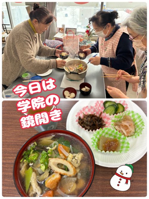 2026年01月27日 学院の鏡開き🍲😋♪ 少し遅れての鏡開きでしたが、お供えのお餅でお雑煮をいただきました😊 昨年よりK先生が作ってくれています。具沢山でお出汁のよく出た美味しいお雑煮です😋箸休めのお料理も用意してくれました…昆布煮、蒟蒻味噌、梅大根、お漬物。こしあんも手作りで、最後はこしあんのあんころ餅をデザートにいただきました☺️ これで学院の先生たちは、無病息災でさらに元気になりますよ♪